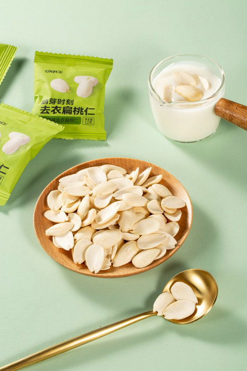 “发芽”后的扁桃仁内部会形成一个中空薄腔,使其具有松脆质地和独特的味道;此外,经过去衣工艺去涩处理,可以让果仁本身的甜味愈发诱人,香味浓郁。