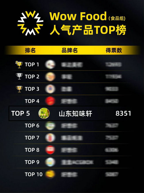 图为Wow Food人气产品TOP榜,山东知味轩公司位列第5
