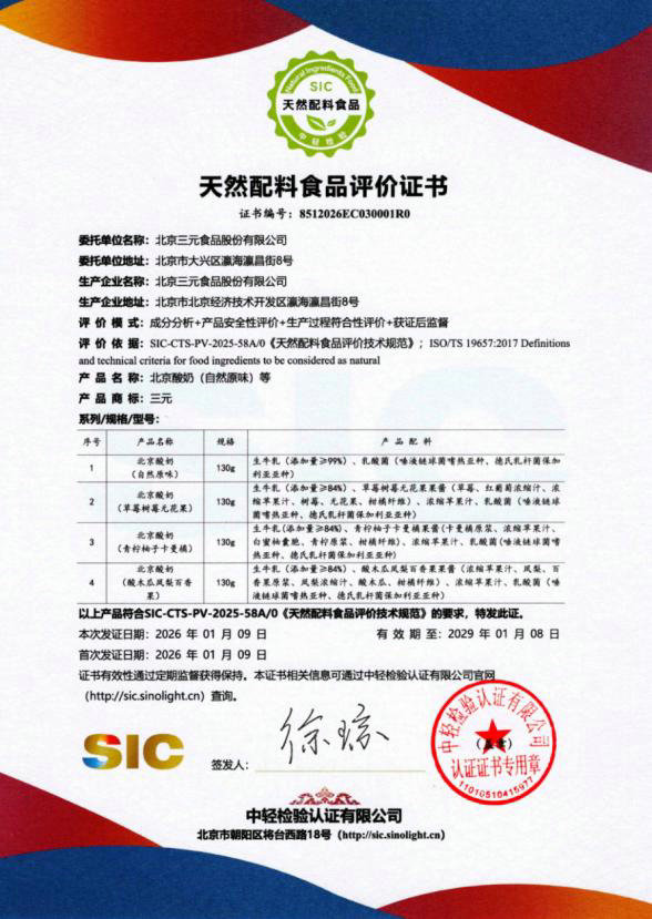 “北京酸奶”在今年1月上市,则是三元股份战略深化的关键落子。作为第二大战略单品,其以“天然配料酸奶开创者”为定位,斩获“清洁标签0级”“天然配料食品”双认证,打造产品创新壁垒。凭借极简配方、高营养密度,生牛乳含量高,零添加,蛋白质含量远超行业平均,精准契合成分党需求,同时依托优质自有奶源与头部合作伙伴,建立全链条品质管控。