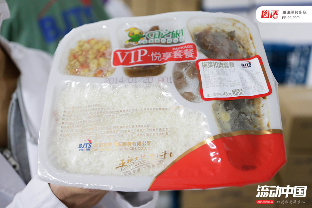 而盒饭的质量和价格却一直受人诟病。不少旅客都曾遇到过一辆小车来回几趟,盒饭价格也跟着变化几遍的经历。往往是新出锅的热盒饭,30-40元;转一圈回来变成了20元;最后盒饭凉了,变成10元出售。图为刚出炉的梅菜扣肉套餐,可保质3个月,标价45元,但隔着塑料膜可以清楚地看到,其实只有两三片肉。新京报