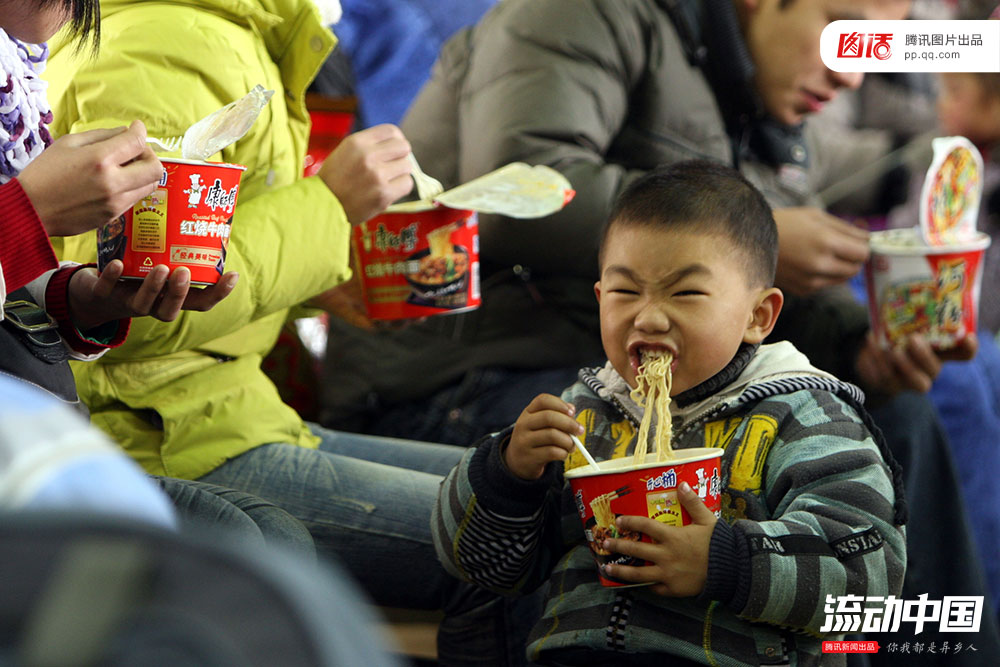 如果不想吃火车上的盒饭,那么十有八九的旅客都会首选泡面,堪称第一“美食”。曾经听说过,有不少平时不怎么吃这种速食的人,一到了出行坐火车时,就会迅速被那种独特的气息所感染,泡上一盒面,再加上一两根火腿肠,滋滋有味地吃个满头大汗。图为2009年春运期间,杭州火车站候车大厅内,一位小男孩和家人一起吃泡面。视觉中国