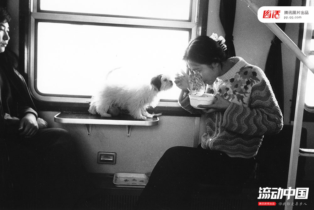 摄影师王福春的系列作品《火车上的中国人》里记录了大量与吃有关的画面。图为1995年,从齐齐哈尔开往北京的列车上,一名女子吃着泡面,旁边的宠物狗也忍不住凑过去嗅了嗅。正是从八九十年代开始,方便面才在中国逐渐变得流行起来。王福春/视觉中国