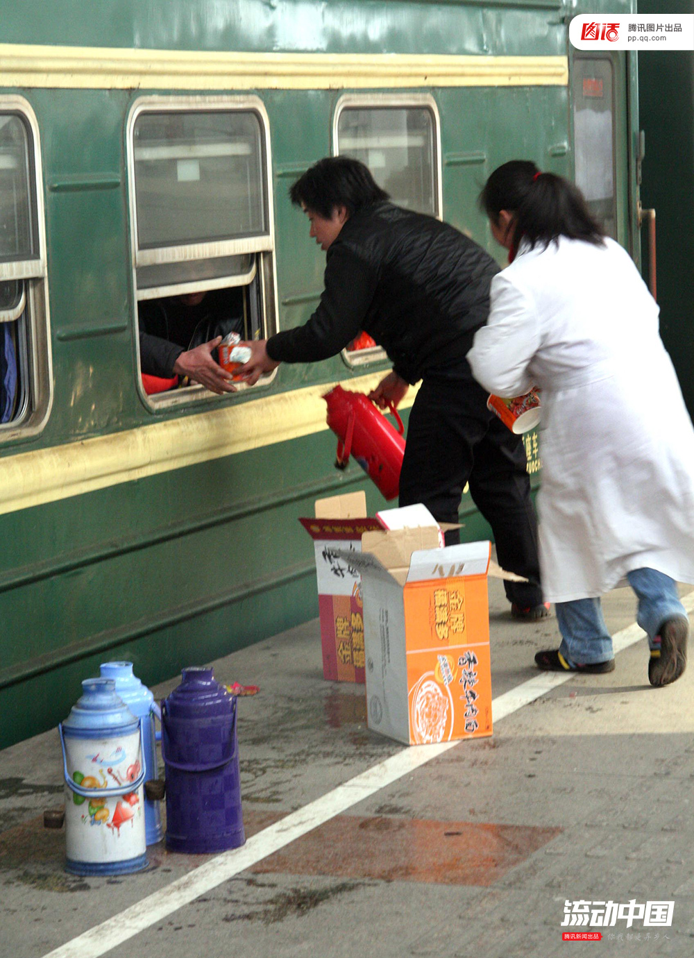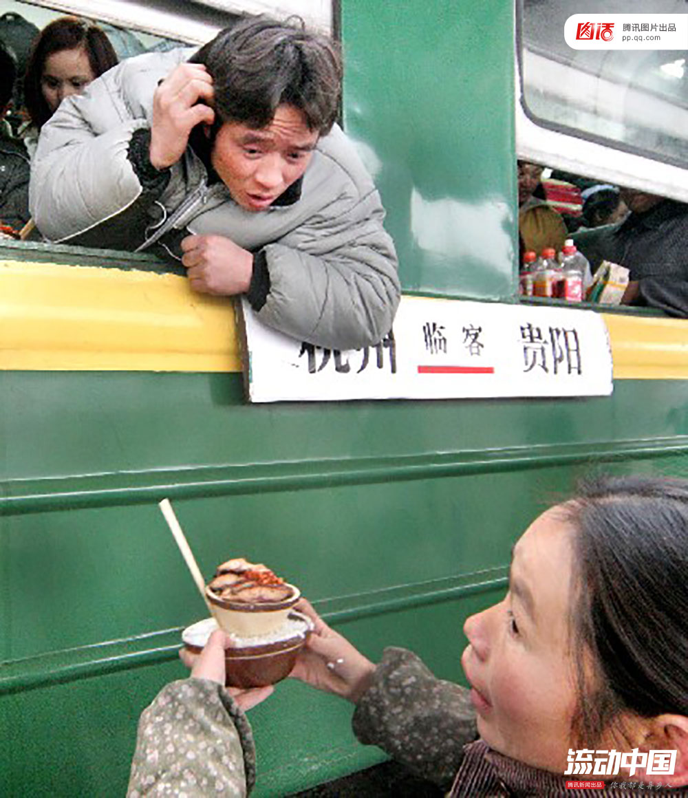 图为2009年春运,南京火车站的小贩向停靠火车上的旅客售卖方便面,还提供开水直接帮忙泡好。王丰/Fotoe