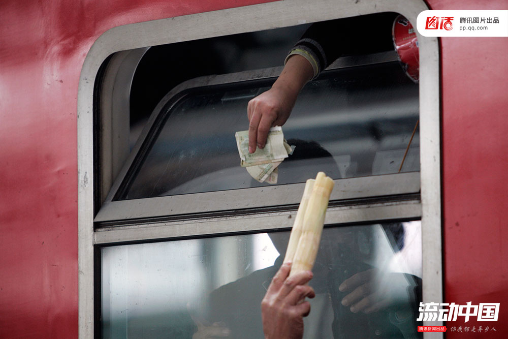 图为2011年春运期间,湖北襄阳火车站,已经登车的旅客从车窗伸手递钱购买甘蔗。李溪/视觉中国