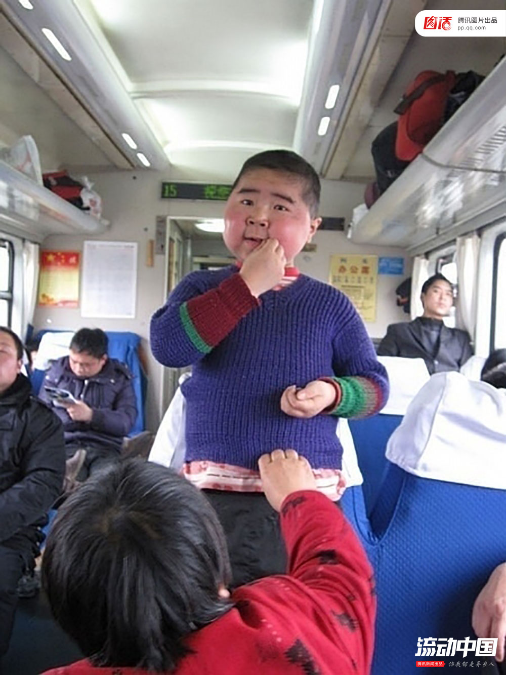 在诸多零食中,瓜子是旅客打发无聊的必备神器。图中这个小胖墩,站在座位上,鼓起腮帮子嗑瓜子,让人忍俊不禁。