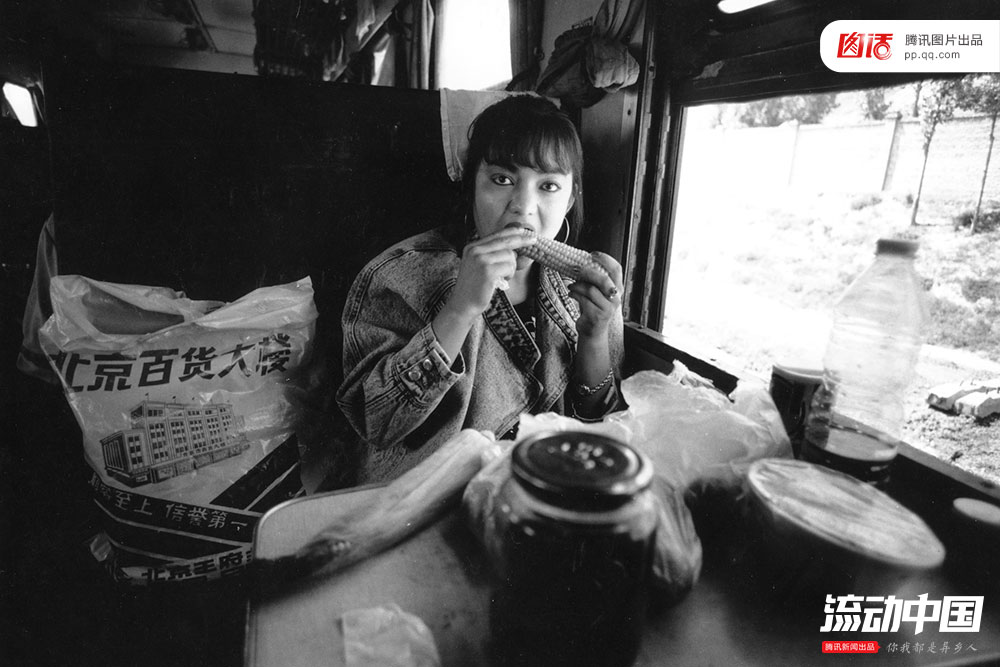 图为90年代,一名在火车上吃玉米的女青年,她面前的桌上还摆满了吃的东西。王福春/视觉中国