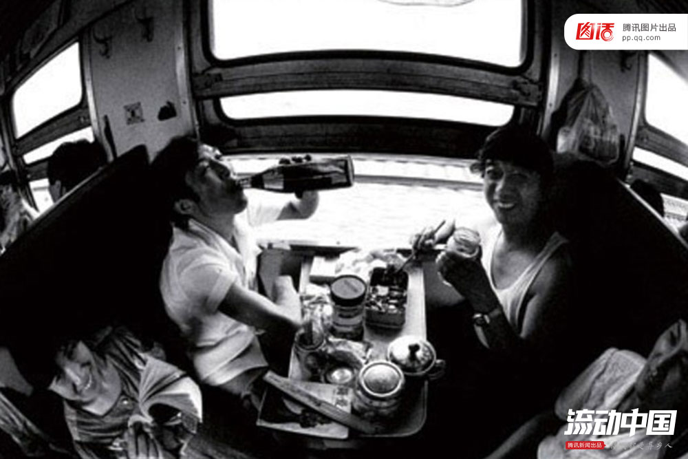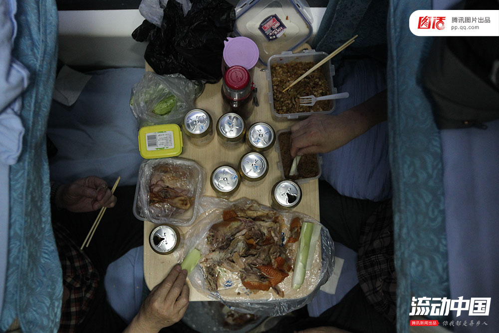 在春运这个亿万国民迁徙的大舞台上,火车上的吃饭问题虽然不能跟买不着票这一世纪难题相比,但也能从一个侧面反衬出这几十年来的出行变迁。图为两名去海南过冬的旅客在车厢内喝酒吃肉。新文化报记者