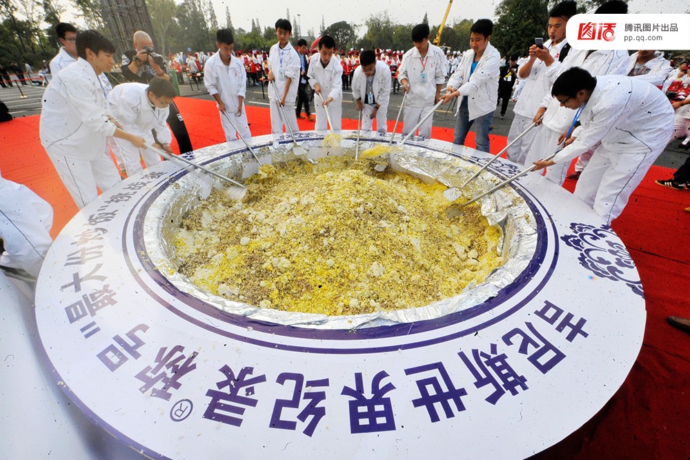 日前,扬州4192公斤重的“最大份炒饭”刚刚刷新吉尼斯世界纪录,就被拉走喂猪,此举在引发网友吐槽后,吉尼斯官方旋即宣布该纪录无效,最后成了一个闹剧。世界纪录一度被人们赋予了挑战极限、超越自我的精神内涵,其巨大的影响力吸引了很多商家将其当做炒作的平台。近年来,一些“世界最大”的纪录不断涌现,这些刷数据式的纪录本身技术含量很低,且缺乏实用性。而其背后则是靠量堆积与善后处理不当造成的浪费。图为2014年4月26日,耗用3吨食材的世界最大份辣椒炒肉在长沙出锅,民众在雨中抢食。