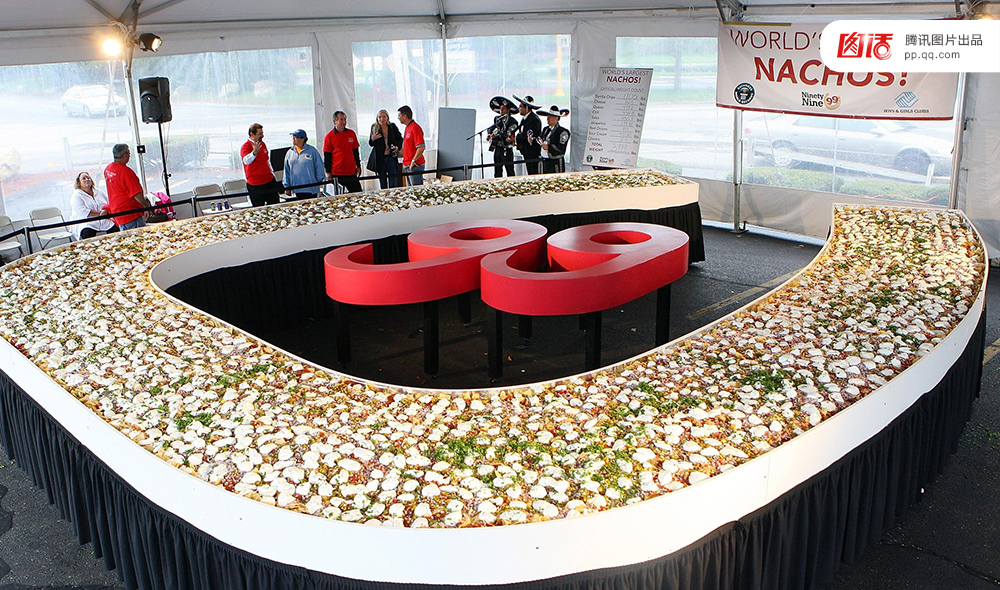 国外商家在创这些纪录方面丝毫不输国内。图为2011年10月1日,美国马萨诸塞州比尔里卡,99餐厅的工作人员做出了一份重达3999磅的墨西哥风味烤玉米片,创造了世界最大烤玉米片吉尼斯纪录。