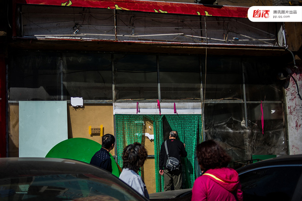 两名市民在青岛乐陵路62号向门里张望,发生“38元天价虾”的这家饭店的招牌已经被剪去,但仍有不少人前来围观,俨然已经成为“景点”。