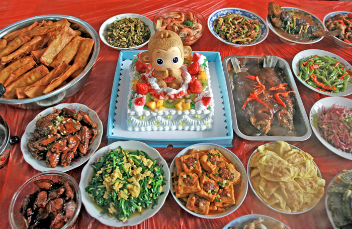 当日,居民们各显身手,煎、炒、烹、炸、蒸……一道道家常菜摆满了餐桌,品种丰富,色香味俱全,大家共同感受欢乐、和谐的邻里之情。图为百家宴流淌着浓浓邻里情。