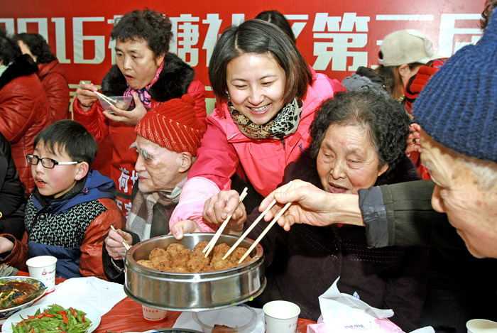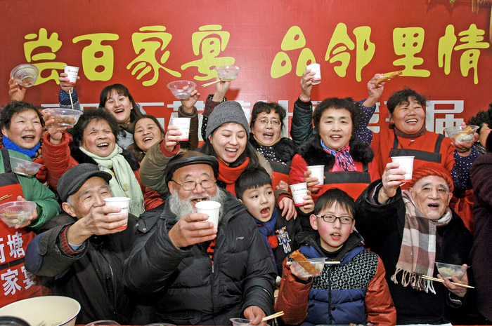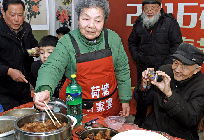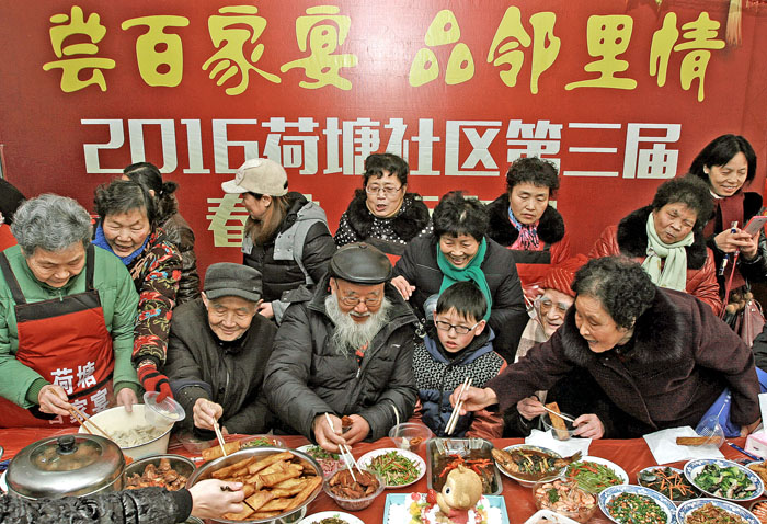 2月1日,安徽省芜湖市镜湖区荷塘社区举办一场以“尝百家宴、品邻里情”为主题的第三届百家宴活动。图为11点不到,居民就纷纷端来自己的拿手菜。
