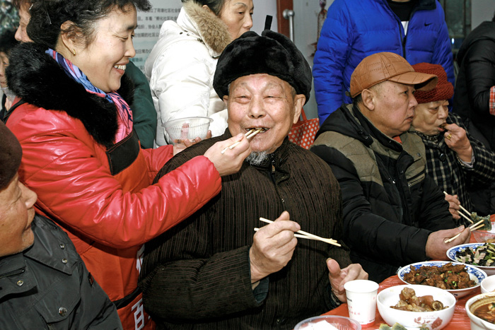 现场最开心的要数几位独居的老大爷和留守儿童,他们的子女和父母都不在身边,社区举办的百家宴让他们感受到别样的亲情。图为开席前居民们端着自己做的菜留下温馨的合影。
