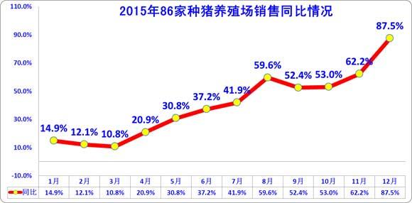 调查全国86家种猪养殖场销售数据显示,2015年受高猪价刺激,种猪销量同比增幅40.9%。,逐季大幅提升,其产下的仔猪会在2016年后期成为育肥猪陆续供应市场,生猪供应量逐步增加,影响猪价下降。