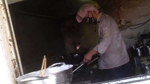 调查采访中记者还发现,路旁有一家名为“宏伟快餐的餐馆。在饿了么上的店铺名叫“宏伟餐厅”。灶台就在门口露天摆放,上面布满黑黑的油渍;厨师用脏得看不清原色的抹布,将锅里、锅底擦了几遍,然后又将抹布垫在炒勺上;漏勺就放在脚边的脏水桶上,用时拿起来不加清洗直接使用;菜品出锅时,厨师将手指伸进锅里蘸出汤汁,伸进嘴里尝味道,感觉滋味不够好,又将菜品倒回锅里再次翻炒。