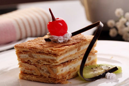 拿破仑蛋糕的法文名为Mille feuille,即有100万层酥皮的意思,所以它又被称为千层酥。