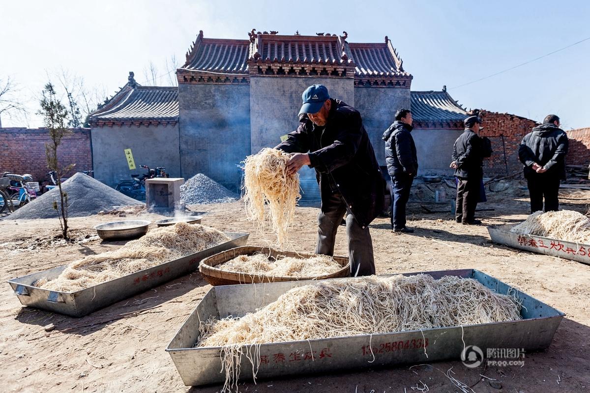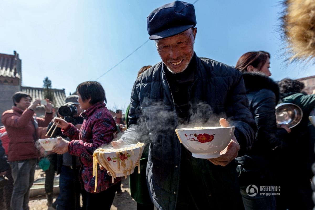 今年,白龙潭庙支起了三口大锅,所做的汤面条可供约2000人食用。不到一个小时,三口大锅内的面条便被抢食一空。