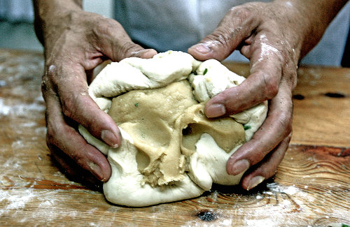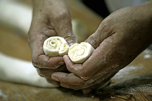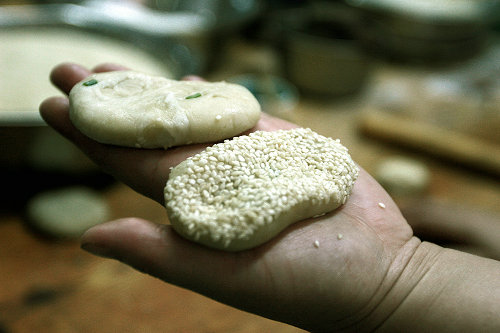 酥烧饼的芯馅制作最为考究。通常供应的有葱油咸酥烧饼和糖酥烧饼两种。葱油酥烧饼的芯馅制法是:将生猪花油寸余长的小段,加入28%精细盐(冬天加25%细盐),拌均拌透混合腌制,约一星期后,用绞肉机将生猪花油绞成泥状,沾上适量葱花拌合均匀成馅。糖酥烧饼的芯馅是用50%的绵白糖、30%的精白粉、20%的熟菜油和少量桂花拌和均匀作馅。葱油和糖酥两种烧饼的制作都必须做到揉面适中,逐个装馅,逐个擀制成型。按传统习惯,葱油烧饼为腰型,糖酥烧饼为圆形。两种烧饼都用熟糖稀刷面,表面贴满脱壳芝麻。芝麻的加工也很精细,先将芝麻放入清水中浸泡约40分钟,在其中吸收水分膨胀鼓起来时,放入面臼内用木捶冲至芝麻的皮、仁离开时,用清水漂去浮起的外壳,取芝麻仁晒干后使用,这种脱壳芝麻,油脂充分溢出,香味浓郁。