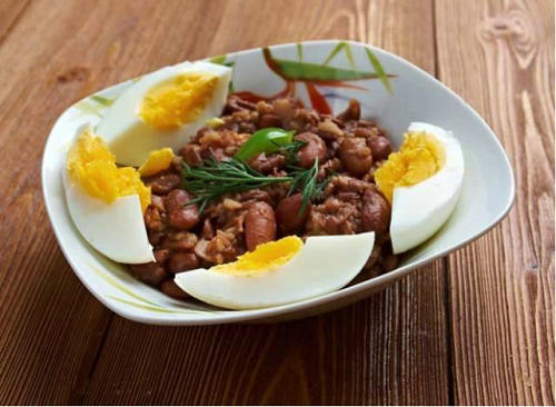 Medames”的埃及传统美食,据说可追溯到法老王时期。蚕豆炖上一夜,再用小茴香、香菜叶、大蒜、洋葱、柠檬汁和辣椒调味,有时也会加上切碎的水煮蛋。这道菜的饱和脂肪和胆固醇含量都很低,还富含膳食纤维和铁、锰等元素。