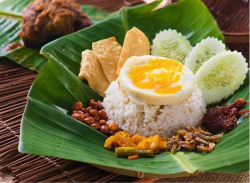 Lemak)的椰浆饭鲜香美味,用椰奶浸泡后煮成,配上凤尾鱼、黄瓜、花生、鸡蛋和辣酱,包在芭蕉叶中,洋溢着浓浓的马来风情。比起上文介绍的其他早餐,这一道的脂肪含量稍高,同时也富含锰元素、蛋白质和碳水化合物。