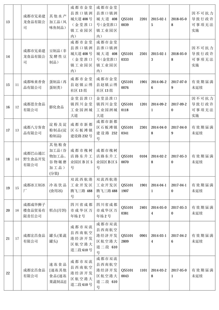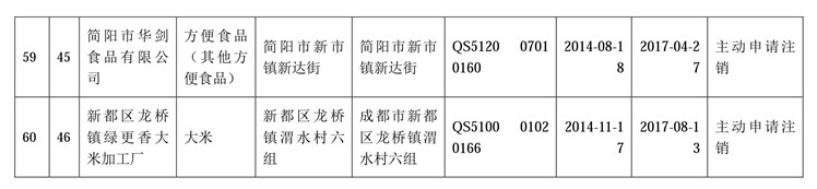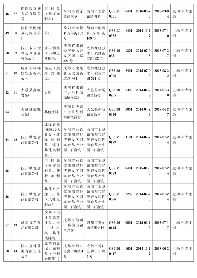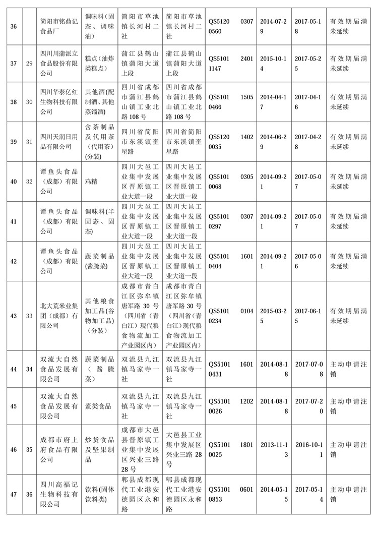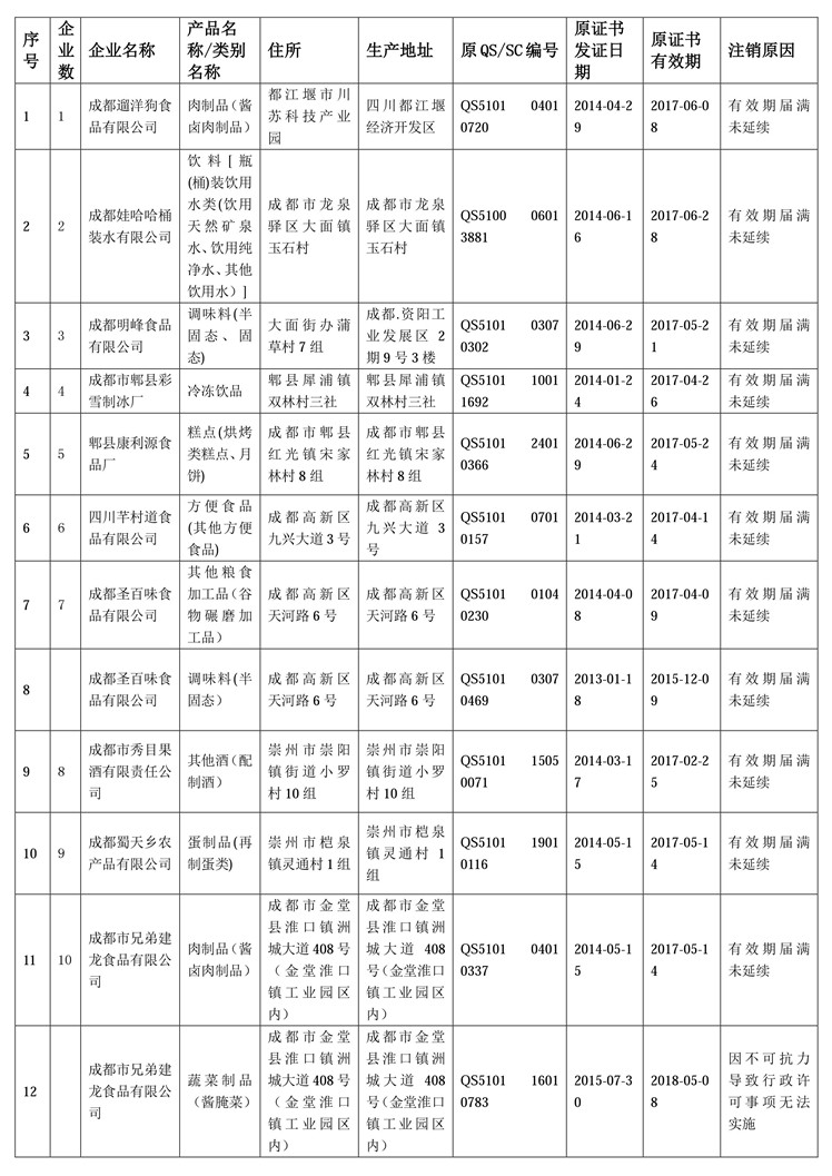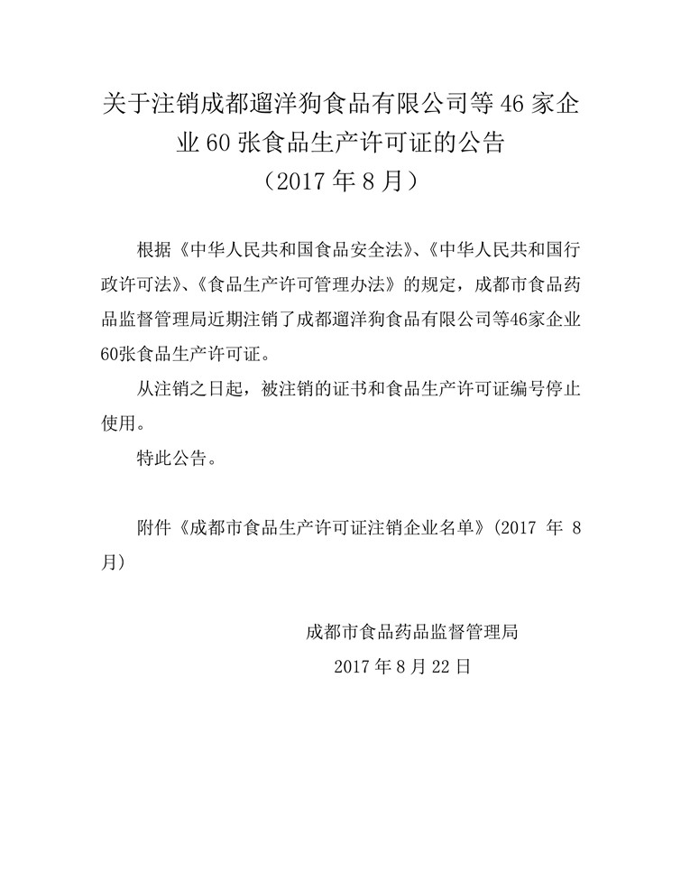 本网讯 据悉,成都市食品药品监督管理局近期注销了成都遛洋狗食品有限公司等46家企业60张食品生产许可证。根据《中华人民共和国食品安全法》、《中华人民共和国行政许可法》、《食品生产许可管理办法》的规定,从注销之日起,被注销的证书和食品生产许可证编号停止使用。