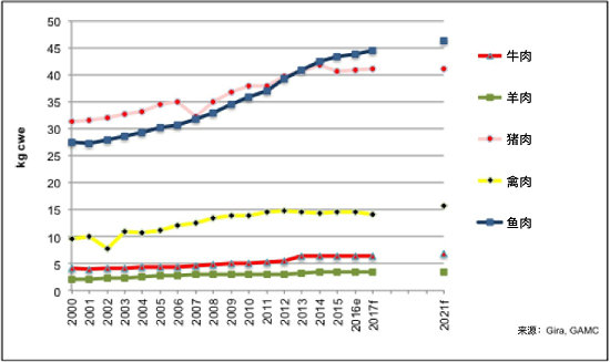 在所有的肉类食材中,猪肉作为众多菜肴的主要原材料无疑是最受消费者欢迎的肉类食材之一。根据下面两张图可以看出,2005年~2017年间,猪肉占总肉类消耗量的比重一直保持在百分之六十以上,是最受消费者欢迎的肉类食材之一。