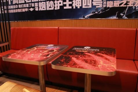 墙面上巨大的坦克正“破墙而出”,宣誓“坦克压倒一切”;餐桌椅被设计成了红黑色调,“熊熊烈火”燃烧不止……由专业设计师操刀打造的坦克世界主题餐厅,从点餐台、桌椅到墙面、地面,隐藏着众多让玩家眼前一亮的“小惊喜”,让“车长”们热血沸腾。