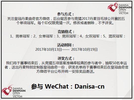 当然,除了选手之外,此次丹麦公开赛还有一个让人眼前一亮的变化,那就是丹麦本土品牌Danisa皇冠丹麦曲奇接替原本的羽坛老大哥尤尼克斯(Yonex)成为了2017丹麦羽毛球公开赛的主冠名商。据悉,今年丹麦羽毛球公开赛冠名商的“比拼”可谓相当激烈,在经过国际羽联和丹麦羽协的多轮谈判、比拼之后,最终还是Danisa皇冠丹麦曲奇从众多候选者中脱引而出,笑到了最后。此前皇冠曲奇曾成功赞助了2015、2016两届丹麦羽毛球公开赛,本届更是将老大哥尤尼克斯拉下马,首度成为丹麦羽毛球公开赛的总冠名商,这也是该项赛事历史上罕见的以本土知名品牌为总冠名商的案例。