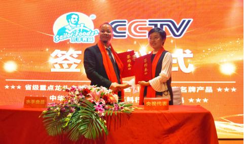 水手食品董事长陈文水与央视代表冯铭宇在签约仪式上