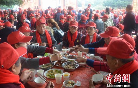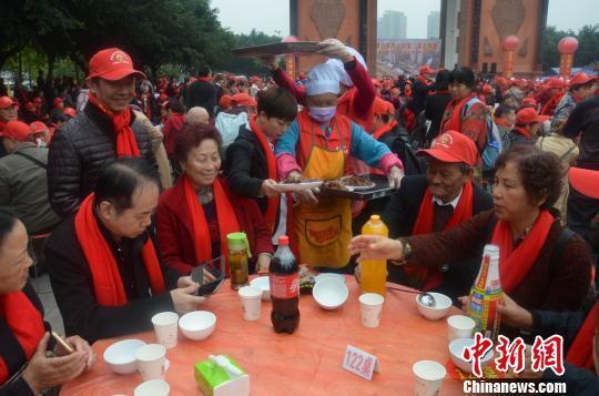 28日,来自四川成都、自贡、宜宾、内江、眉山等地60岁以上的3600余名老人,齐聚眉山市彭山区“中国长寿城”牌坊下共享360余桌“长寿坝坝宴”,欢度重阳节。