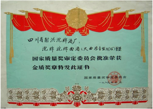 ▲沱牌所获1989年国家名酒金质奖奖状