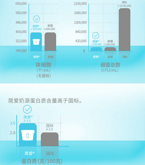 基于这样的品牌理念,简爱酸奶严格筛选奶源品质。一般来说,在奶制品质量标准中,奶源中的蛋白质含量越大越好,菌数总数越小越好。据朴诚乳业供应链中心数据显示,2020年简爱酸奶使用的原奶核心指标基本上为每100毫升蛋白质不低于3.2克、体细胞少于40万/ml、菌落数小于10万CFU/ml。简爱酸奶的质量指标不仅大大高于国标,达到甚至超过欧盟标准!