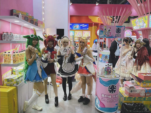 展会当日,乐体控的两款产品——气泡茶汽水及气泡茶系列在西部会展中心的5号馆,一亮相便受到了众人的瞩目。场馆主设计色调以粉色为主,设计风格软萌可爱,更有二次元cos扮演者,为观众带来了与众不同的参展体验。