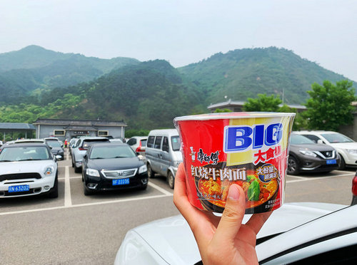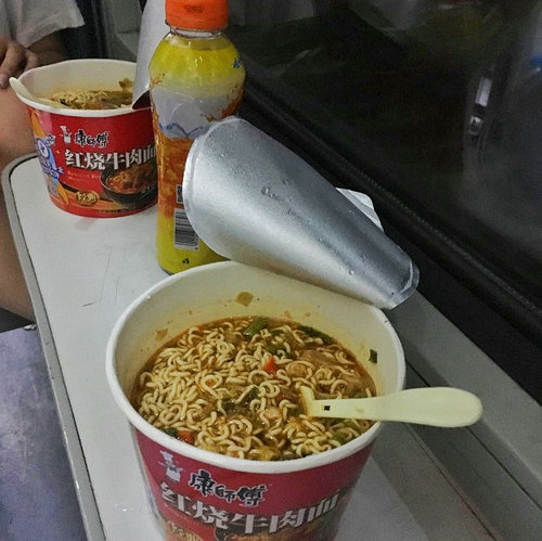 路上饭点,周瑜明有时候会拿准备好的小型酒精炉煮一壶热水,然后泡一桶康师傅红烧牛肉面。红烧牛肉面是各种口味泡面里最被人所熟知的泡面,这也恰恰是周瑜明选择这个口味的理由。
