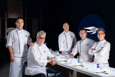 千年画卷从丝路山水缓缓展开,大董师傅作为中国意境菜创始人,亦是让中国味道和审美“走出去”、西式技法和食材“走进来”的代表人物。他所烹制的前菜丝路花语所用的石榴籽和苜蓿,皆由丝路而来。郭元峰师傅人称 “食材猎人”,用火踵、膳肚和燕窝,重制唐代烧味宴上名震一时的名菜,是为火朣凤凰胎。“做菜顽童”王勇师傅则让《山家清供》的经典名菜蟹酿橙,脱胎换骨为乐绎蟹酿橙,再见新意。“川味先锋”兰明路师傅则用本地香辛料茱萸结合辣椒,创作出茱萸戏星斑,便是明代皇帝见了也要馋口;清朝皇帝最爱的猪肉则在大董师傅创作的福庆梅花图中大显身手;来自扬州的青年厨师周弋,则从失传甜点鲍螺获得灵感,用一道甜点一甜千年,结束这场千年之宴。