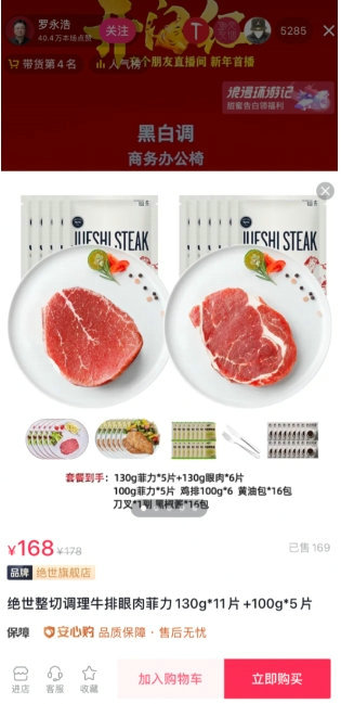 为扩大活动影响力,浓情蜜意闹元宵活动联合罗永浩直播间打造专场福利,通过牛排商品立减10元补贴,为用户的浪漫大餐多加一道源头好菜。