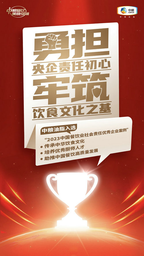 在2024年1月10日召开的中国餐饮业社会责任大会上,业内领军企业及领袖级人物齐聚,共同探讨了餐饮作为刚需行业,以及不断增速升级的产业,在“性价比”时代,应如何找到与环境、社会和自身发展 “和谐共生” 的可持续发展新路径、新价值。在大会 “中国餐饮业社会责任优秀案例” 的评选中,中粮油脂凭借在行业引领与专业坚守的突出表现以及身为央企在履行社会责任方面的积极努力与探索,备受行业瞩目。