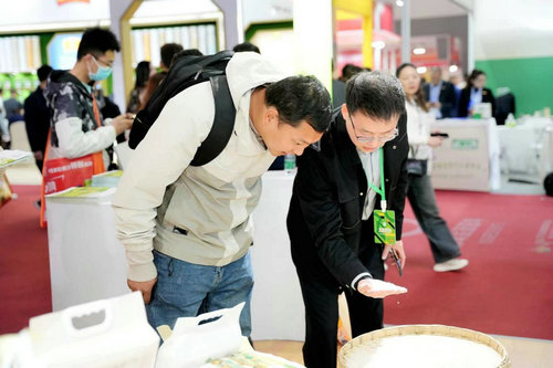 (第110届全国糖酒商品交易会上,丰裕公司副总经理王瑞林向参观者介绍“天府天保”品牌大米)