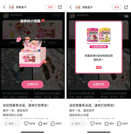活动期间「惊喜盒子」限时掉落,也充分调动起小红薯们的参与热情。搜索【逗在一起趣赏樱】或【M豆逗在一起趣赏樱】并浏览相关笔记,即有机会获得@M&M's送出的春日惊喜。福利机制在高效拉升品牌搜索数据的同时,进一步引爆活动氛围。