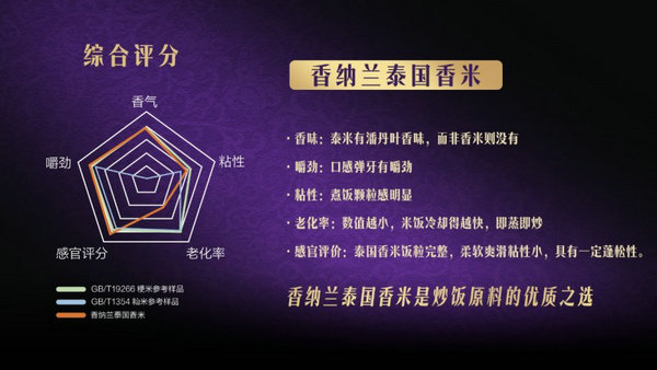 荣誉的获得并不是空穴来风,而是有着强大的科研数据做支撑。大师赛现场益海嘉里研发中心工程师高明(博士)和中国烹饪协会总厨专业委员会秘书长翟春燕女士现场演绎,揭开了香纳兰泰国香米适合炒饭的奥秘,他们将香纳兰泰国香米与市面上主流粳米和籼米从香味、米饭粘性、老化率、弹性、食味值五大维度进行比较发现,香纳兰泰国香米在炒饭品类胜出,成为五星总厨炒饭优选大米。高明博士表示,益海嘉里一直专注国人饮食健康,致力于传播健康饮食文化。以此次炒饭大师赛为契机,益海嘉里将继续在产品端不断创新,推出更健康、更营养、更安全、符合消费需求的产品。