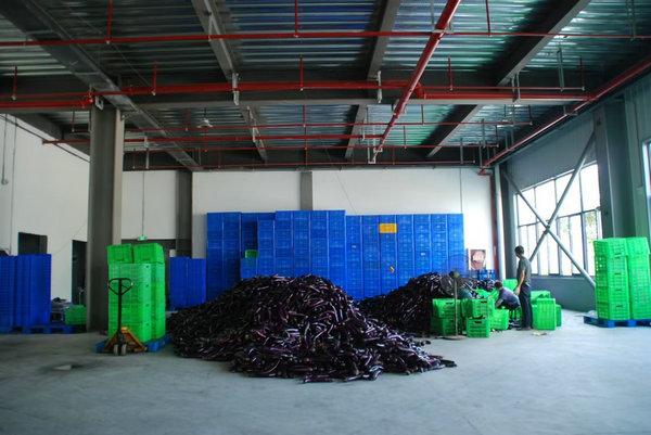 图为丰产期的紫皮长茄被堆放在仓储车间