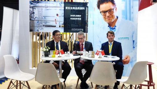进博会签约现场:从左至右分别为丹麦阿拉食品原料集团总经理果基施锑先生、丹麦驻华大使 马磊先生、阿拉食品原料亚洲区负责人亚历山大先生