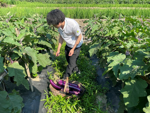 调研团看到辛苦忙碌的农户们,便主动下到地里去帮助农户收茄子。在专家和农户的指导下,调研团们很快就掌握了什么样的茄子就是成熟可以采摘的,拿起剪刀便热火朝天地地干了起来。收好一定数量后,又将一个个装满茄子的背篓背起,往着货车走去,仅是来回几趟,便已是汗流浃背。团队成员周凡感慨道:“背茄子不仅要弓着身,还得挺着腰板,茄子才不会从背篓里掉下来,而且还要走那么远的路。走上几趟就累的不行了,这些农户们还得这样在田里干上一个上午,实在是很辛苦的。”