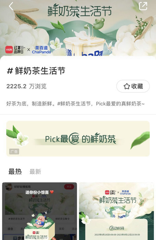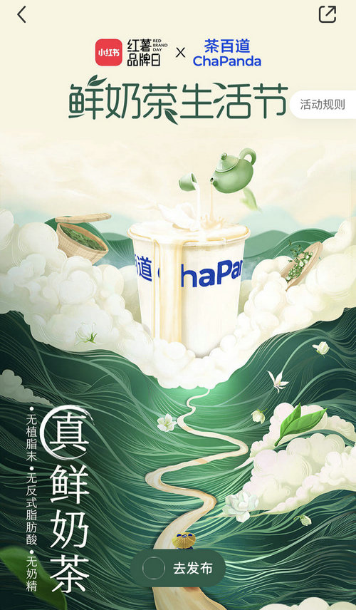 而小红书作为2亿用户的生活经验分享平台,拥有用户自发对奶茶品牌和新品尝鲜、测评、分享传播的优渥土壤,在此次茶百道推出鲜奶茶新品之际,小红书与其强强联合,共同打造#鲜奶茶生活节#,通过一系列优质活动内容和定制玩法,引爆线上线下多维度用户互动狂欢。