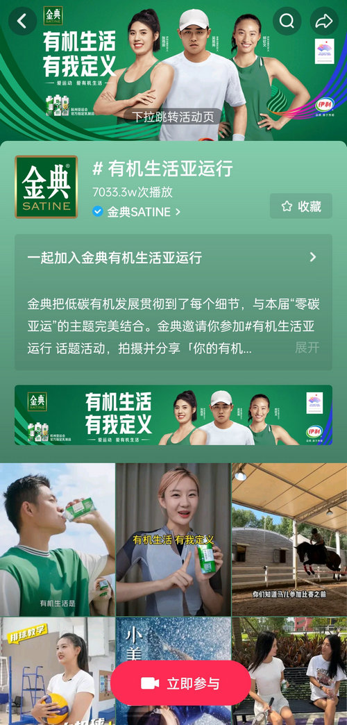 亚运会期间金典携手抖音官方,结合亚运契机协伊利金典限定呼伦贝尔有机纯牛奶联动头部体育明星和达人们,以强大号召力共同掀起大众的助威声量,让14亿观众都能在这场全场全球盛宴中实现情感共振与UGC创意输出,助力有机生活和低碳亚运更深度融合,建立对金典“绿色有机”的强烈认同感。
