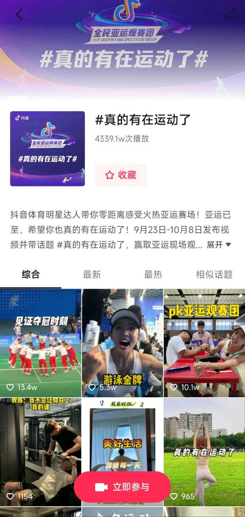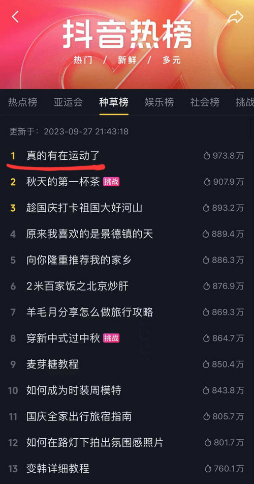 值得一提的是,截止目前,#全民亚运观赛团相关话题收获了1.9亿次播放。金典发起的#有机生活亚运行话题,也收获了7033.3万次播放,话题#真的有在运动了也突破4300万播放量,甚至还登上了抖音种草榜第一。