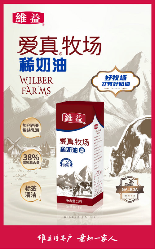 维益爱真牧场稀奶油,好牧场,才有好奶油,坐拥西班牙加西利亚珍稀、纯净奶源,38%高乳脂含量,严选制程、50km直采半径圈,拔高鲜度上限。