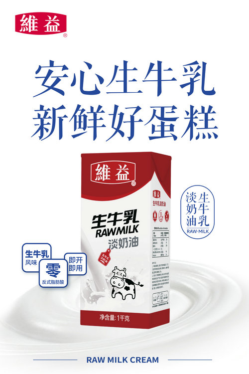 维益生牛乳淡奶油,安心生牛乳,新鲜好蛋糕,生牛乳风味,通过UHT工艺层层提炼,安全营养、风味十足、自然新鲜。
