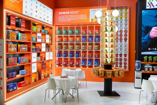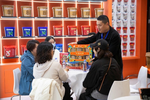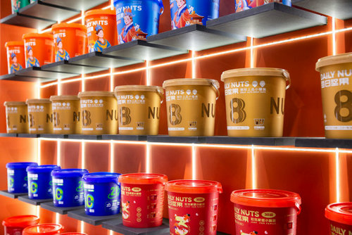 在展位设计上,知味轩延续了品牌经典橙色作为主色调,让整体空间显得大气明亮。让人眼前一亮的是,知味轩将当家明星产品——桶装系列每日坚果搬到了展会现场。本次展会,知味轩打造了一整面“五彩缤纷”的桶装坚果产品墙,有爆款“金桶”、温暖“红桶”、新潮“蓝桶”等,每一款背后,都是对不同人群需求的深刻洞察与创新研发。缤纷荟萃的色系在吸引观众的同时,也在凸显着品牌强大的产研实力。