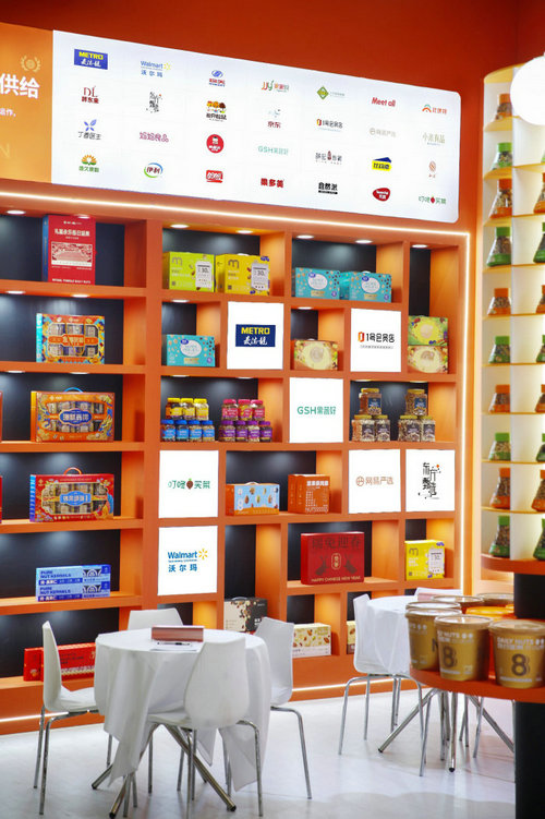 在知味轩展位上,可以看到一面展示着知味轩的代工产品和合作伙伴LOGO的陈列墙。据悉,凭借着在产业链上的实力积累,知味轩已与麦德龙、沃尔玛、网易严选、东方甄选等国内头部品牌以及十余家知名企业达成了OEM战略性合作关系,提供坚果生产、深加工、包装、OEM代工等一站式服务,为合作伙伴全方位赋能。